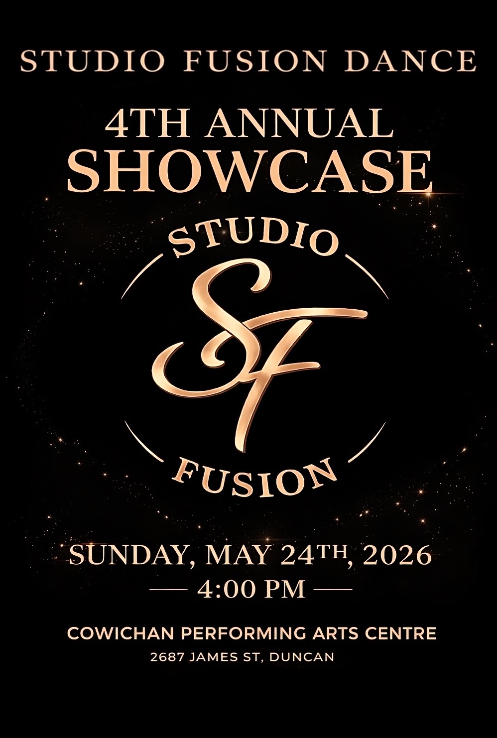 Welcome to Studio Fusion Dance’s 4th Annual Showcase! Get ready to experience an evening of incredible dance performances by our talented dancers. Join us on Sunday, May 24th, 2026 at 4:00 PM at the Cowichan Performing Arts Centre. Our studio is excited to showcase the hard work and dedication of our dancers as they perform a variety of dance styles, including jazz, ballet, contemporary, lyrical, hip hop and musical theatre. This event promises to be an unforgettable evening filled with high-energy performances and amazing choreography. Don’t miss out on this opportunity to witness the passion and creativity of our dancers. Come and support the art of dance at Studio Fusion Dance’s 4th Annual Showcase!